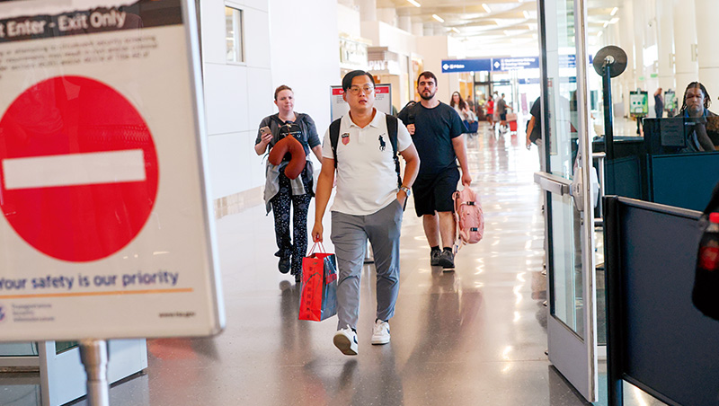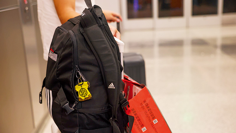 步出機場,帶著媽祖保佑開啟拓荒!他的行李上掛著白沙屯媽祖的吊飾,伴隨著他焦慮緊張前後晃動。(攝影者:楊文財)|放大原圖