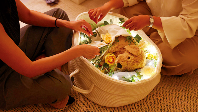 不同於人們印象中莊嚴肅穆的告別式,這裡的環境更像是一處靜謐的療癒空間。儀式從為毛孩梳理毛髮開始、再輕抹腳掌乳液,在禮儀師的引導下,一邊獻花,一邊回想初次相遇的時刻;再提筆寫下卡片,留給牠最後的承諾:家人永遠愛你,也會好好生活下去。