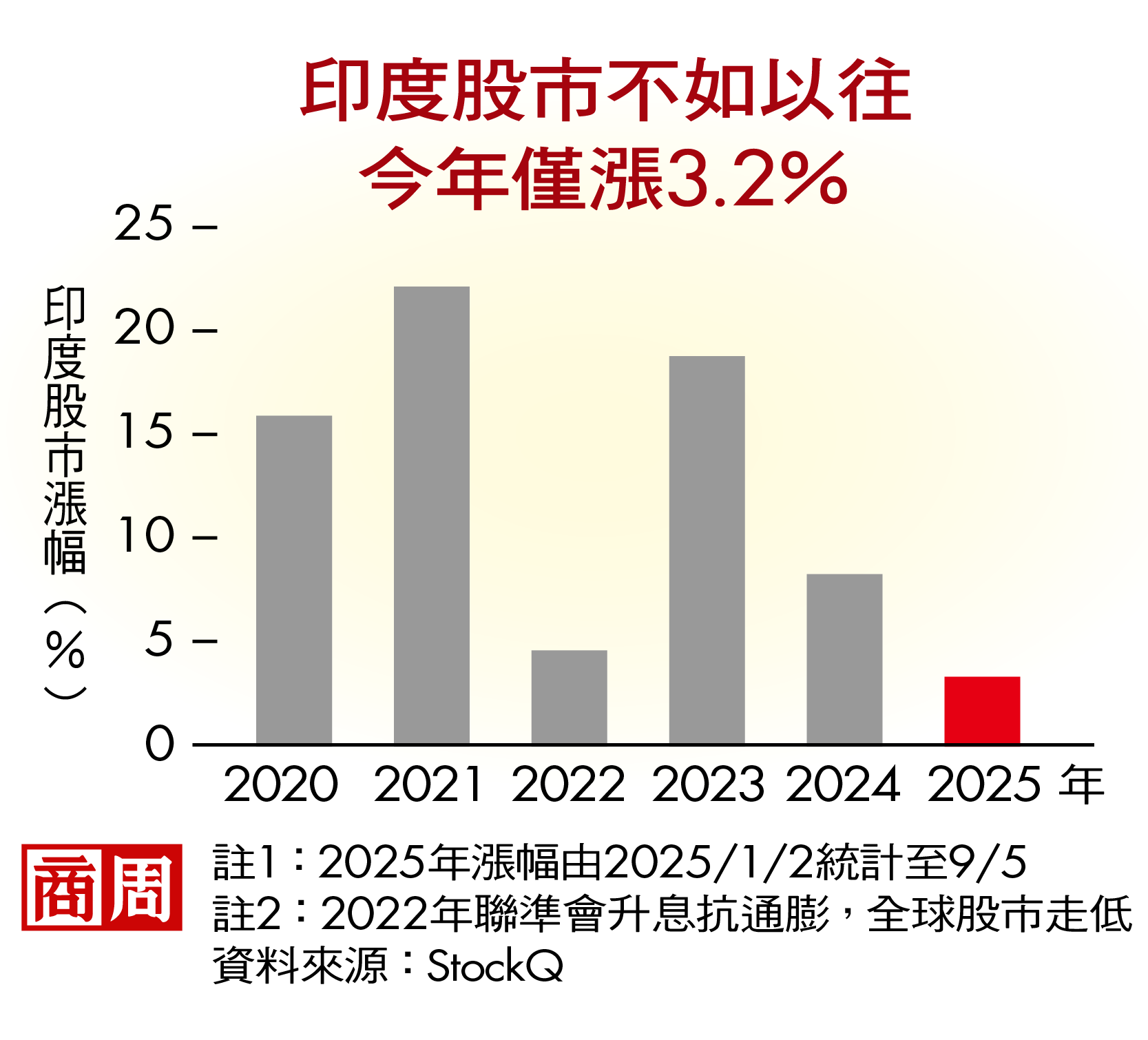 自二○二○年以來,印股有三年每年漲逾一○%,但今年以來它只上漲約三%。彭博新聞網今年八月引述數據,海外投資者今年以來已淨拋售價值一百二十七億美元的印度股票。