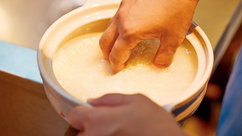 洗米過程,手指要像爪子般輕輕攪動。洗完後靜置浸泡15分鐘,讓米粒充分吸水,才能下鍋。