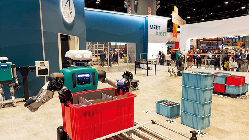 它身高一百七十五公分、體重約六十三.五公斤,一身湖水綠色衣著,兩顆「眼睛」閃閃發亮——這隻名為Digit的人形機器人,正在亞馬遜的倉儲裡來回穿梭。它不僅能把貨物放到兩公尺高的架上、將箱子層層疊高,甚至能蹲下來抬起近十六公斤的物品,移動至輸送帶上,且全程保持穩定不跌倒。