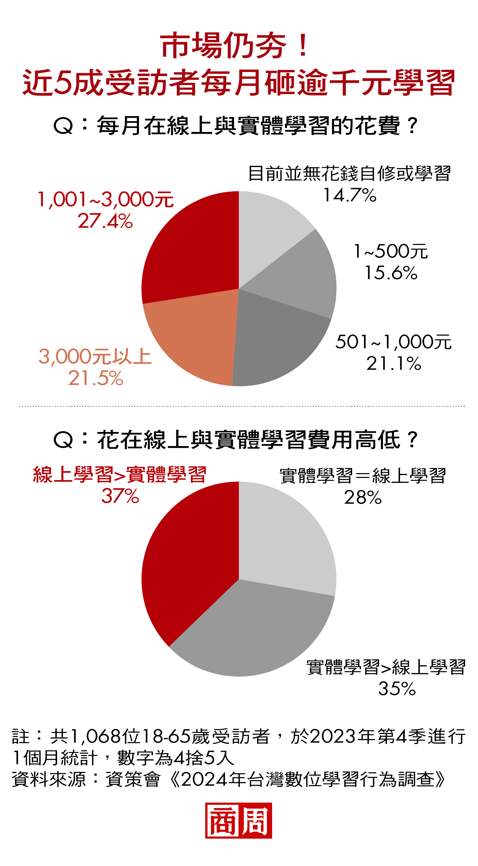 這個合作實際上揭示了台灣線上課市場已從追求擴張用戶的增量時代,轉入留存用戶的存量時代新戰局。根據資策會二○二四年統計,台灣智慧學習產業教學內容產值三百五十億元,線上課平台主攻的技能培訓占比約一九%。有業者預估,線上課平台市場規模約三、四十億元,今年相對去年,整體業績持續成長,只是競爭更激烈。