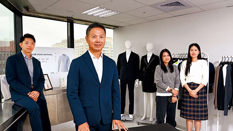 主打「單一材質」的企業制服展示架上,已出現不少金融、科技、航空業者的logo。「5年過去,客戶接受度明顯變高!」新光紡織協理王仁宗(左2)說。(攝影者.程思迪)
