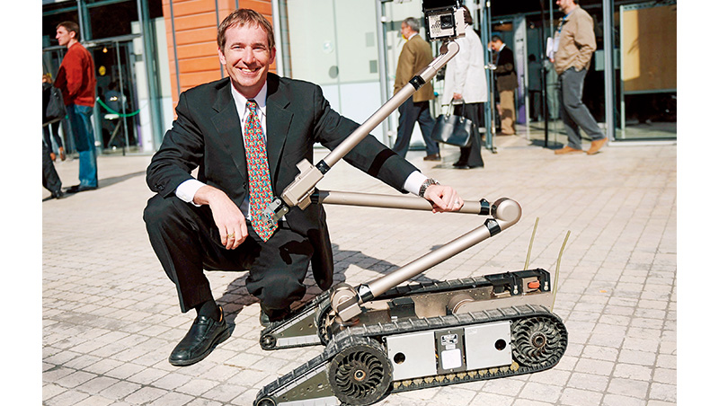 iRobot是國防軍工起家,曾協助911事件等救災。前執行長安格爾(圖)2011年還帶著當時最新的無人地面車輛亮相。(來源.法新社)