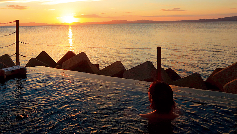 面向橘灣,邊泡海上露天溫泉「波之湯 茜」,最佳入浴時間是夕陽西下黃昏時分。(來源.雲仙觀光局提供)