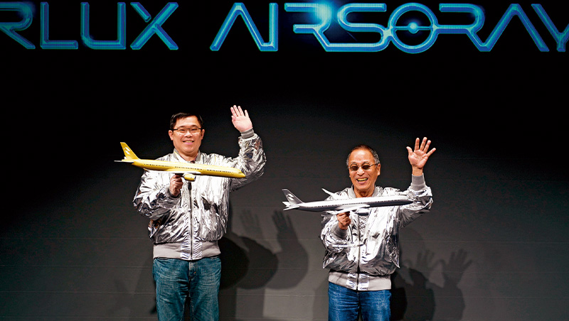 結果,全數落空,和星宇航空董事長張國煒一起站上舞台的,竟是穿著銀色飛行外套,被稱為「機械情慾」創作先驅、七十九歲的日本藝術家空山基。他的創作將漆在下半年交付的兩架新機上,一架金色、一架銀色,外觀相當大膽。