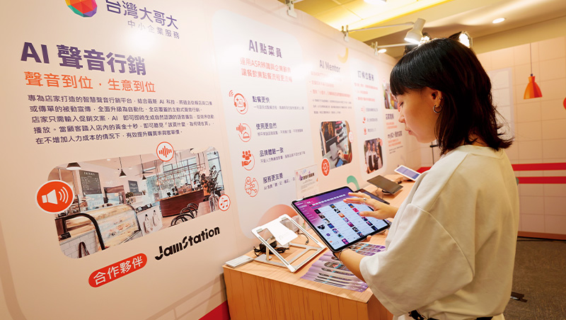 台灣大不只在內部導入AI,更將應用拓展為可對外銷售的產品。圖為其展示與企業合作的AI工具。(攝影者:楊文財)|放大原圖
