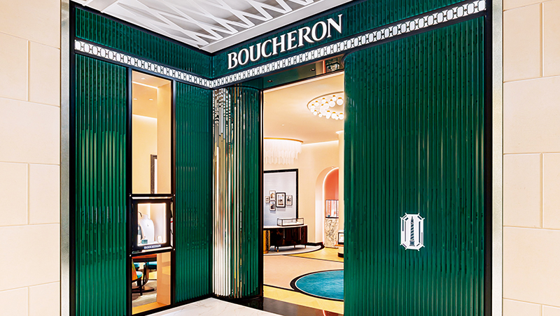 祖母綠金屬稜柱打造精品店立面,產生鏡面折射視覺效果,好似鑽石切面。(來源:Boucheron提供)|放大原圖