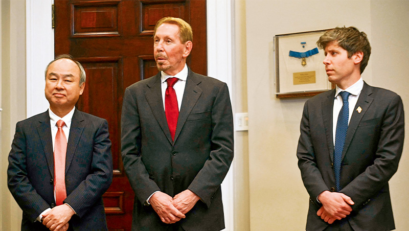 軟銀執行長孫正義(左起)、甲骨文創辦人艾利森、OpenAI創辦人奧特曼今年初為美國AI基建投資案星際之門站台,他們也是如今AI狂潮代表人物。(來源.法新社)