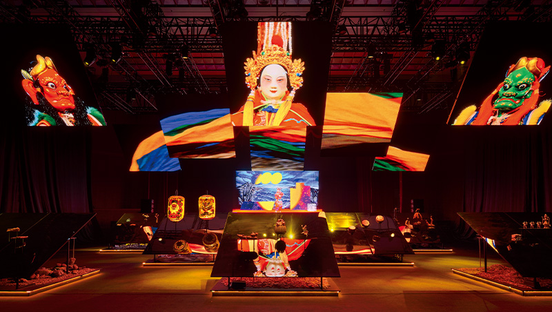 走進「殿氣現場」展區,大型螢幕懸掛在空中,從傳統樂曲到技藝的展現都能仰頭看到。(來源.台灣設計展提供)