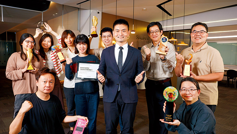 瑞儀永續團隊展示滿滿的獎牌,董事長王昱超(後排右3)說,ESG做得好,對國際購併順利推展,絕對有大幫助。(攝影者.楊文財)