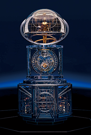 瑞士鐘錶製造商江詩丹頓(Vacheron Constantin)為了紀念品牌二百七十週年推出的壓軸大作是台高超過一公尺、重約二百五十公斤的天文鐘「時間的探索(La Quête du Temps)」,除了能夠顯示各種曆象資訊之外,座鐘的上半部罩著一個透明穹頂,穹頂下是一尊名為「天文學家」的活動人偶,一旦啟動機關,人偶便會抬頭伸手指向漂浮在穹頂中的數字,報知當下時刻。