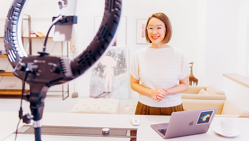 為掌握社群節奏,吳丹鳳每週固定發3篇含影片文章,以維持粉絲黏著度。工作室配有筆電、燈光、麥克風與布景,拍片道具一應俱全。(攝影者.陳鴻文)