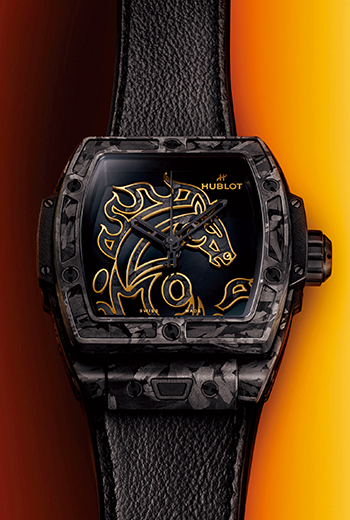 宇舶延續其「融合藝術」精神,推出 Spirit of Big Bang馬年限量款。錶款採用極具現代感的深色霜狀碳纖維打造,其獨特的紋理賦予腕錶強烈的運動氣息。錶盤視覺焦點在於立體的馬年圖騰,象徵著「黑馬」脫穎而出的衝勁,全球限量僅88枚。