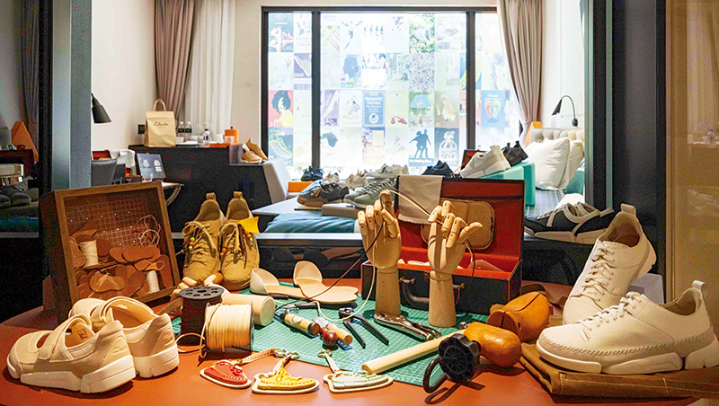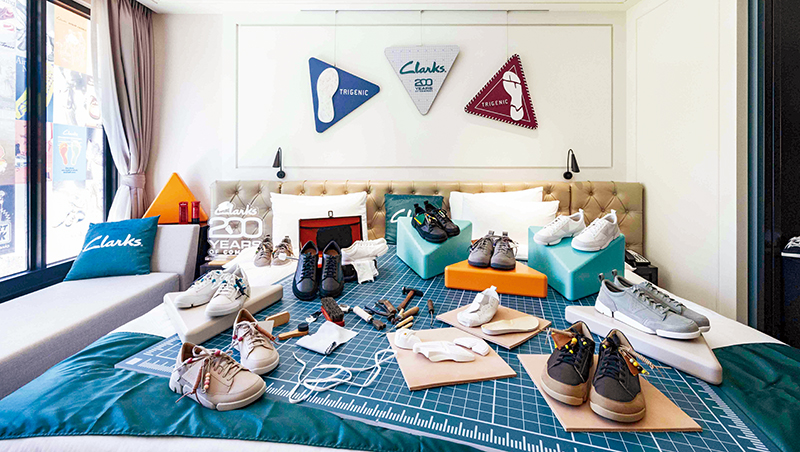 我來到英國鞋履品牌Clarks為慶祝兩百週年,與台北慕舍酒店(Hotel MVSA)聯手打造的主題房,現場陳列品牌經典鞋款。鞋履的起點,是一八二五年賽勒斯.克拉克(Cyrus Clark)與詹姆斯(James)兄弟以羊皮地毯的邊角料打造出一雙室內拖鞋。據說品牌總部所在的英國薩默塞特郡坐落一座製鞋博物館,保存超過兩萬五千雙鞋及鞋款設計史,如果依照鞋跟接鞋尖排成一列,總長超過十二.九公里。