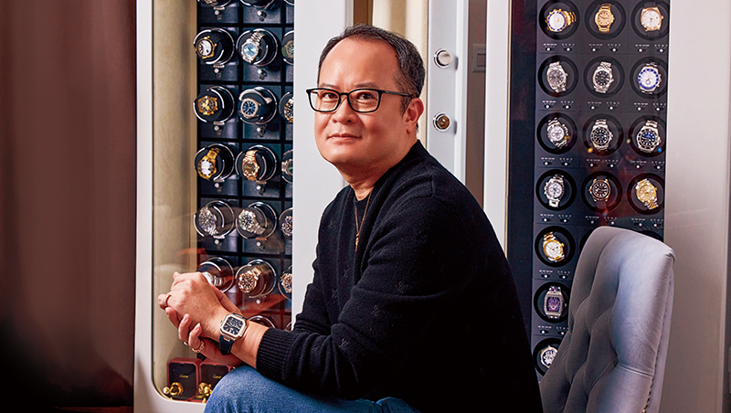 走進詠浤鑫董事長曾勢竣的家中客廳,最先映入眼簾的,是好幾座透明櫥櫃,櫃裡排列著上百支機械錶,在恆定轉動中,靜靜占據客廳各個角落。