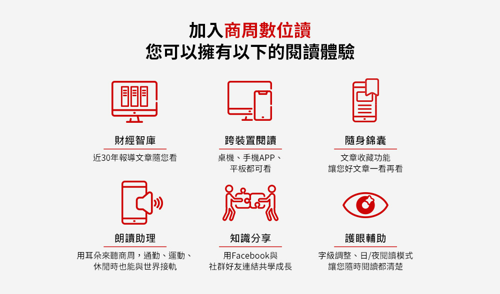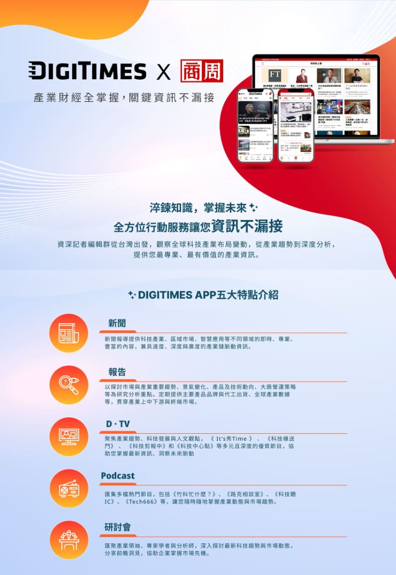 DIGITIMES+商周全方位閱讀半年方案 DIGITIMES+商周全方位閱讀半年方案 超值優惠-聯購半年方案,每日只需24元 超值優惠-聯購半年方案,每日只需24元 - + 優惠價$4400 市價 $5,500 加入購物車 直接購買 商品特色商品規格購物說明 商周數位訂閱 全方位的數位訂閱服務 隨時隨地 知識在線 商周超過25年以上的編輯團隊,從紙本周刊到數位閱讀 讓您隨時隨地看到每日編輯精選,內容推薦+每週個人電子報 超過5萬篇以上的報導資料庫,可以讓你更了解市場、看透產業趨勢尋找新契機 *商周全方位閱讀包含:紙本半年26期+數位訂閱半年6個月,紙本與數位起訖相同 超值優惠-聯購半年方案,每日只需24元 - + 加入購物車