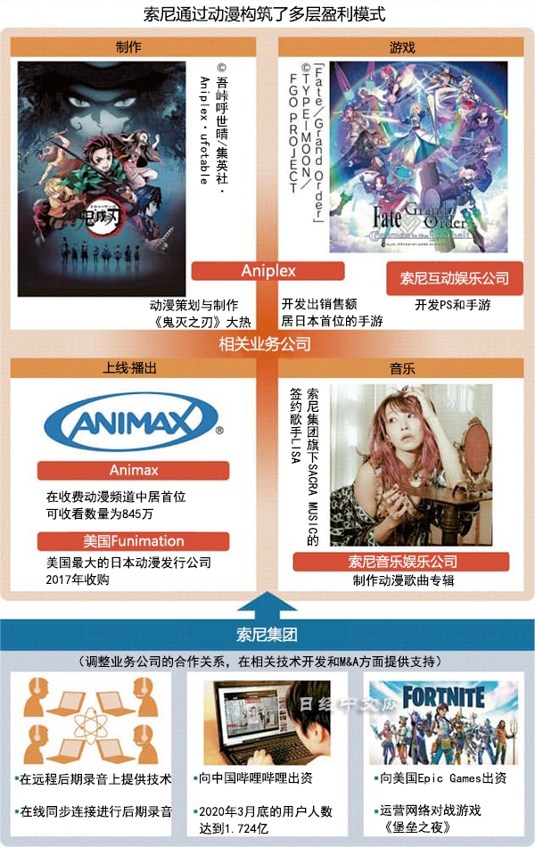 新動畫攻略的理想模式正逐步顯露出來。索尼7月對運營人氣對戰遊戲《堡壘之夜》等的美國Epic Games公司出資2.5億美元。《堡壘之夜》的遊戲社區內還會舉行演唱會等活動,越來越像一個數位娛樂平臺。索尼將建立舞臺和機制,將動畫IP傳遞給更多粉絲,從後方支援其向世界拓展。索尼對嗶哩嗶哩的出資也有開拓中國市場的目的。