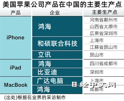 蘋果公司一直將大部分關鍵産品,如智慧手機iPhone和平板電腦iPad,外包給台灣企業生産,許多工廠分散在大陸,這增加了蘋果在生産方面的地緣政治風險。
