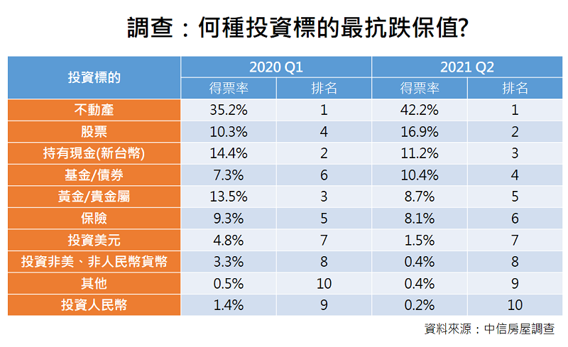 根據中信房屋2021年所做的調查顯示,民眾看好抗跌保值的投資標的,首選「不動產」,占比高達42.2%,其次才是「股票」(16.9%)、「現金」(11.2%)、「基金及債券」(10.4%)、「黃金及貴金屬」(8.7%)。