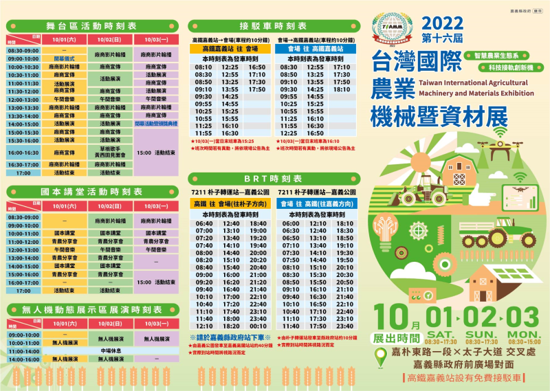 由嘉義縣政府與台灣農機工業同業公會共同主辦的「2022第十六屆台灣國際農業機械暨資材展」,將於10月1日至3日於嘉義縣政府前廣場對面(嘉朴東路一段與太子大道交叉處)盛大舉辦,本次展會首次在嘉義縣舉辦,吸引國內外近500家業者參與展出,共上千個攤位,為全台最大的農機展。就是要讓全台的農友能近距離了解各種新式農機。
