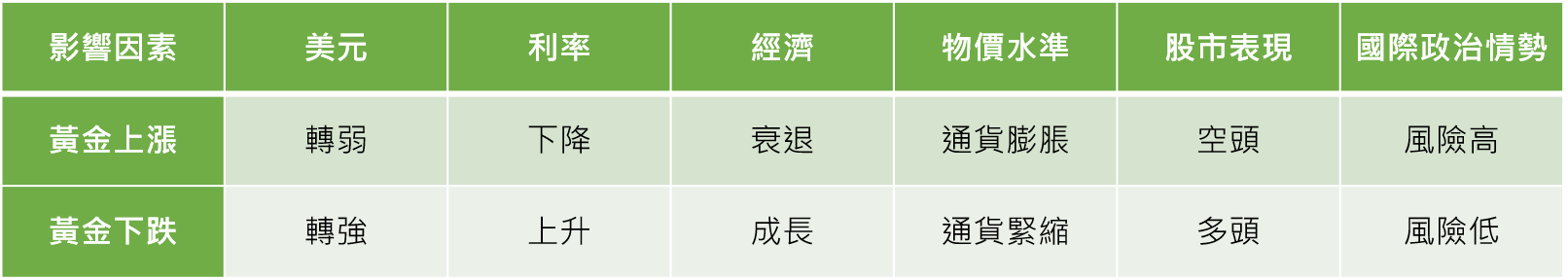 黃金價格易因需求變動、通貨膨脹,美元利率的強弱及經濟政策、國際政經情勢及市場風險而波動,相關變化因素對照如下: