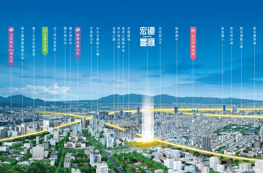 新泰計劃區開發面積約397公頃,為新北最大市地重劃,位處市區核心,匯集便利交通優勢,包括機捷A5站,僅4站即可抵達台北車站雙子星特區,加上5分鐘直上65快速道路,來往雙北迅速跨界,且離新莊成熟機能僅一路之隔,坐享繁華無需等待。