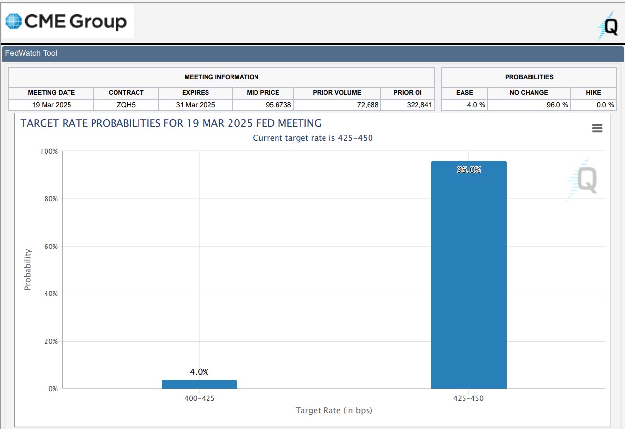 首先,可以善用芝商所(CME) 的官網當中提供的未來經濟事件,這些經濟事件對特定的金融商品就會產生不同程度的波動率,尤其在期貨選擇權的交易上,隱含波動率亦是非常重要的數據,當波動率越大,不論是多頭市場或是空頭市場,都可以讓短線的交易創造出更好的績效!此外,CME 提供的FedWatch工具也十分實用。這個工具主要整合了市場對未來美國聯準會升息或降息的預期概率,幫助投資者快速掌握市場動態。下圖展示了FedWatch的介面,根據該網站的算法,3月份會議中降息1碼的機率為 4%,而維持現狀的機率則為 96%。