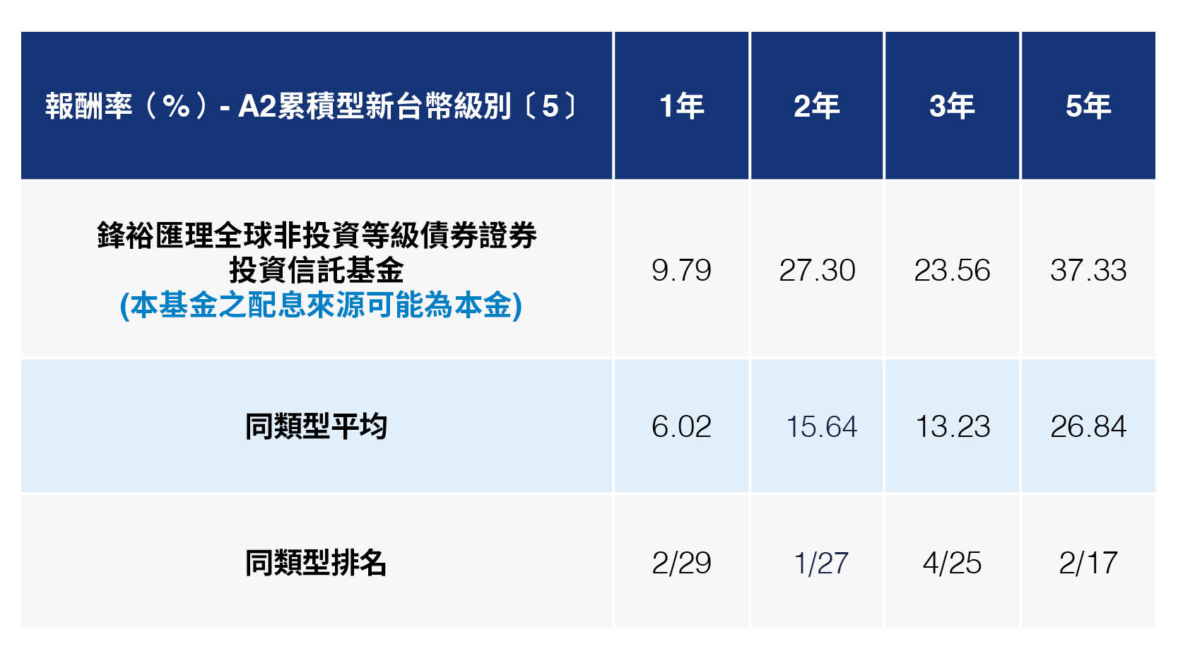 [5]資料來源:理柏,資料日期:2025/3/31。同類型基金採用SITCA分類之非投資等級債券-全球型,新台幣主級別為參考。過往績效不保證未來結果。