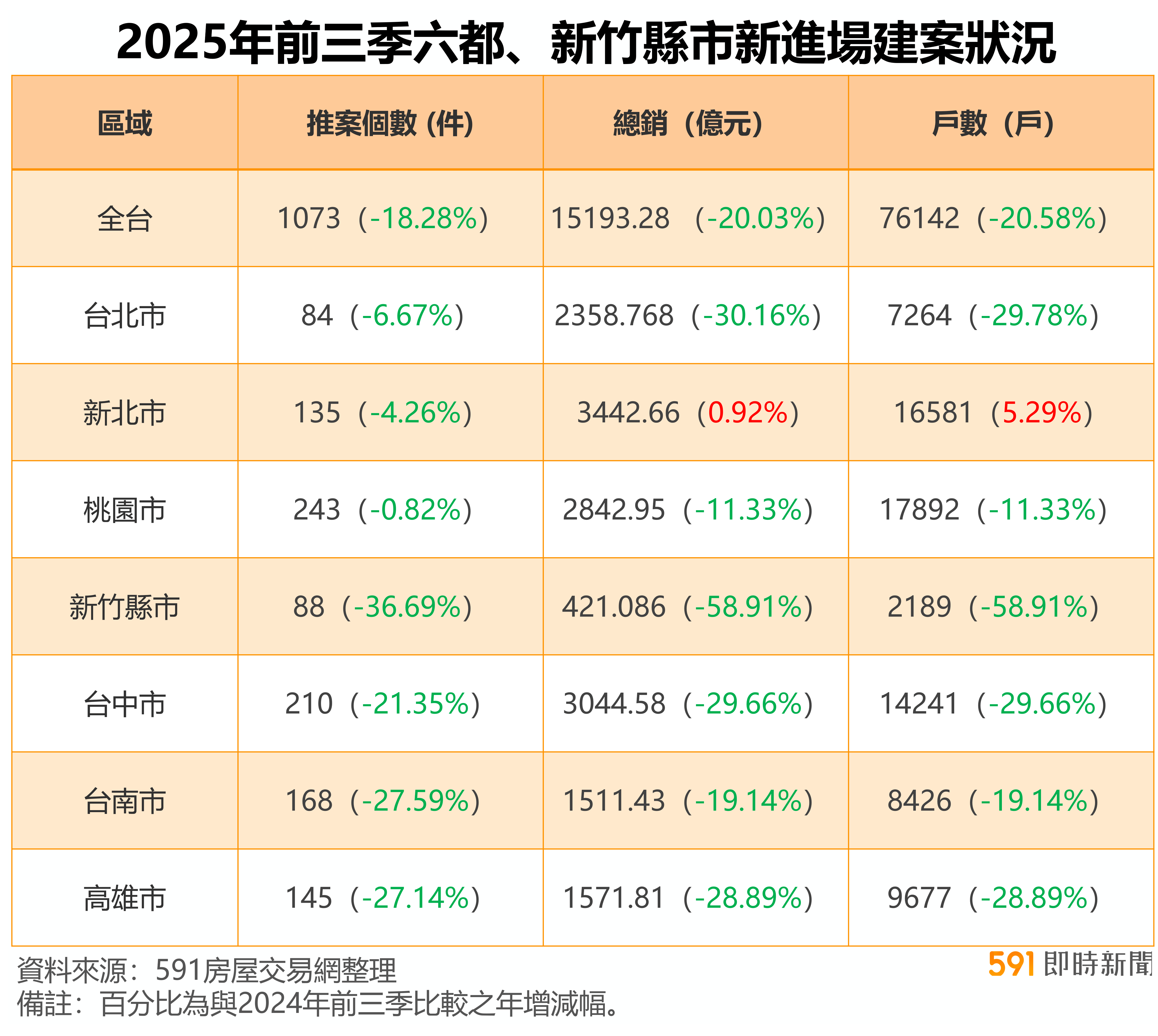 2025年房市在政策調控下持續盤整,市場觀望情緒升高。591新建案統計,今年前三季六都加新竹推案總銷約1.5兆元,年減約20%,整體推案量1,073個、年減18%,成交量亦同步縮減。觀察季度變化,第一季受春節與金龍風暴影響,市場全面降溫;第二季雖仍有政策干擾,但較前一季略有回穩;第三季案場人潮持續下探,即使建商讓利並有9月政策鬆綁,加溫效果仍有限。