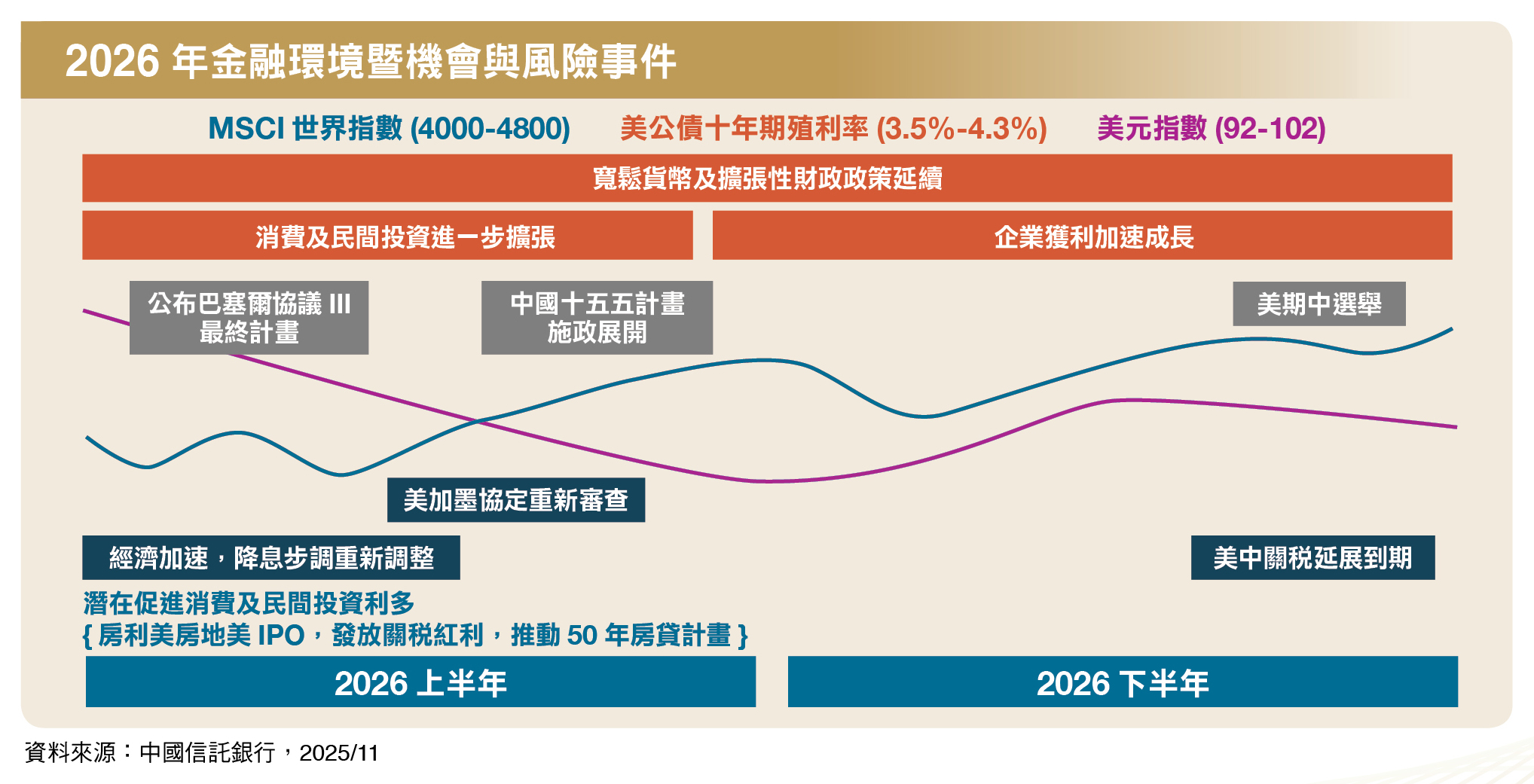 整體而言,2026年投資前景在政策支持與AI長線趨勢延續下仍屬正向,但挑戰與波動也不小,投資人須在搭上成長列車時,同時繫好安全帶,全方位抗擊風險,才能維護資產淨值韌性,迎接另一個豐收年。