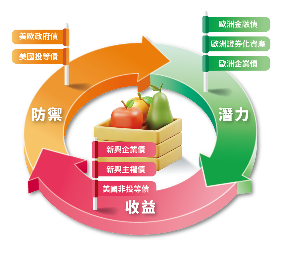 「潛力配置」則聚焦歐洲金融債與具基本面支撐的信用債種,在資本結構與監管環境改善下,提供兼具收益與資本利得的潛在空間。透過主動選債與靈活調整,掌握歐洲金融債獨特的「匯益雙收」優勢 - 利差收斂與匯率避險後的收益,為投資組合增添成長動能。「收益配置」主要布局新興市場主權債與企業債,受惠於多國財政體質改善與信評升等趨勢,提供相對具吸引力的殖利率水準。透過分散國家與產業風險,並搭配嚴謹的信用分析,在控管波動的前提下,強化整體收益長期報酬風險表現。