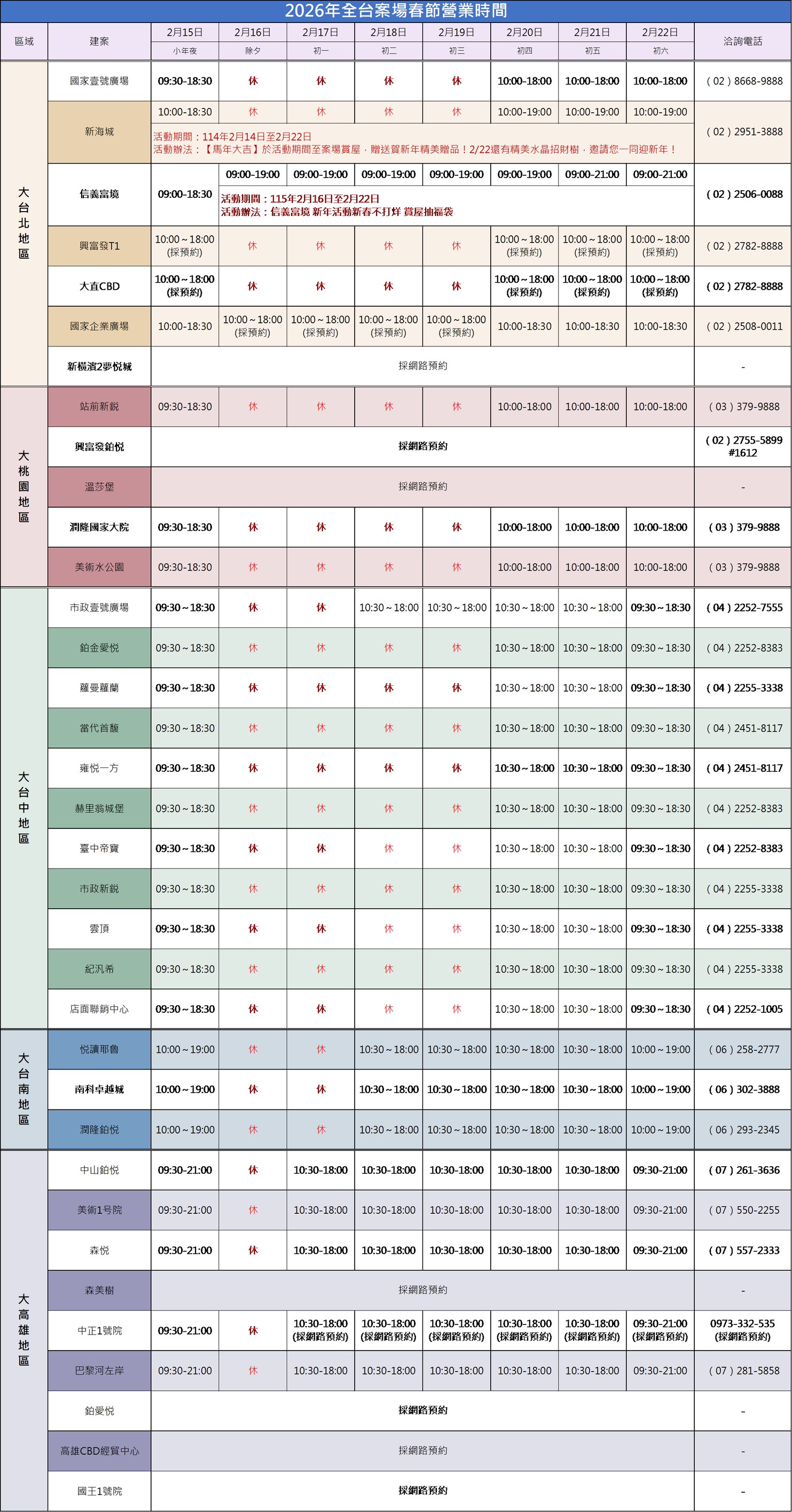 敬請詳閱全台各接待中心春節營業時間