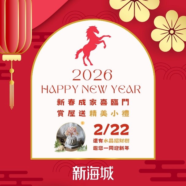 【新海城】活動超吸睛,114年2月14日至2月22日馬年大吉,凡於春節期間至案場賞屋,贈送賀新年精美贈品!2月22日還有精美水晶招財樹,邀請您來一同迎新年!