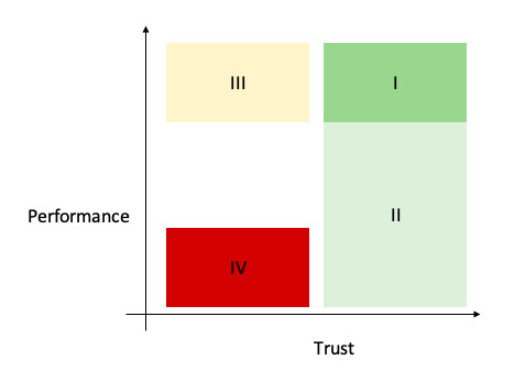 多增加一個 Trust 維度,可以有助於去評估衡量到底在「管理能力」上是否能淘汰一個顧人怨的傢伙。人才的優先順序就是 I > II > III > IV,III 是最容易被誤判的,因為能力很強、信任度很低,這時候領導人就必須展現智慧,知道 III 可能帶來短期的效果、卻導致有毒的環境 (Toxic Environment);從無限賽局的角度來看,II 都絕對比 III 還要來的重要許多。