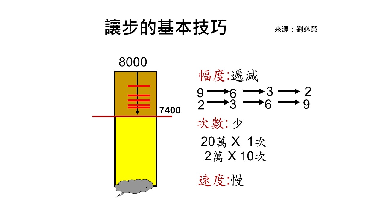 所以,讓步時一定要注意三個原則:幅度要遞減、次數要少、速度要慢。如果非讓不可,劉必榮強調,「那你就要做損害控制——想辦法把眼前的讓步變成一個特例,而不是一個先例,找好理由,把你的讓步合理化。」