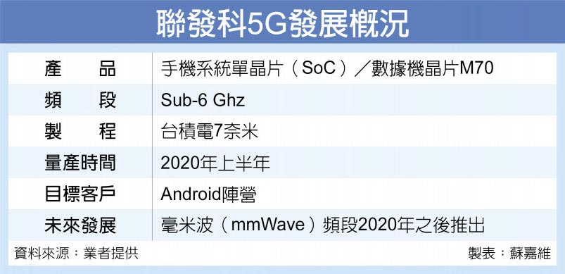 供應鏈透露,聯發科的5G數據機晶片Helio M70下半年量產,5G SoC可望在年底完成設計定案(tape-out),都將採台積電7奈米製程,預料2020年可望開始量產出貨,包括OPPO、Vivo等大筆Android陣營訂單屆時也可望落入聯發科口袋,大啖5G手機晶片商機。