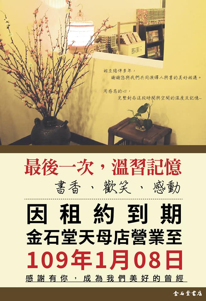 有近30年歷史的金石堂天母店,在7日於粉絲團公告,因租約到期,2020年1月8日將會是最後營業日,成為天母商圈倒店潮的新案例。