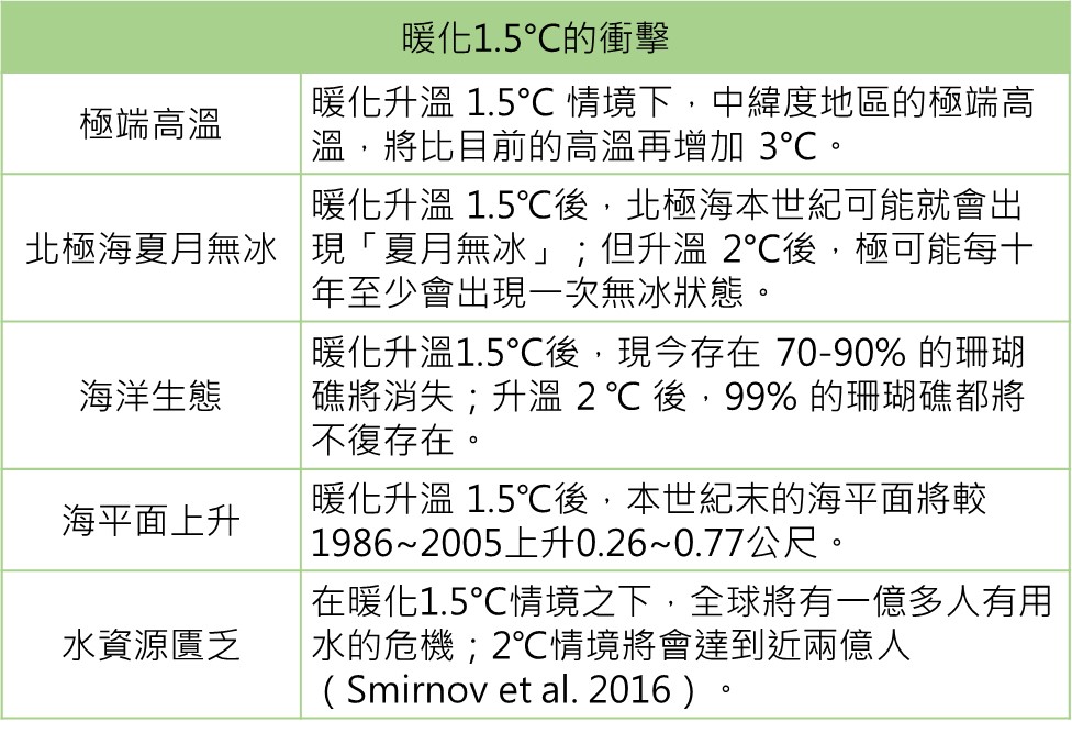 這份報告將成為今年底國際氣候談判(COP24)的重要科學依據。報告指出,最晚在2052年,地球升溫就將突破1.5°C,若要使均溫回到1.5°C以內,全球的二氧化碳排放量必須要在2050年歸零。