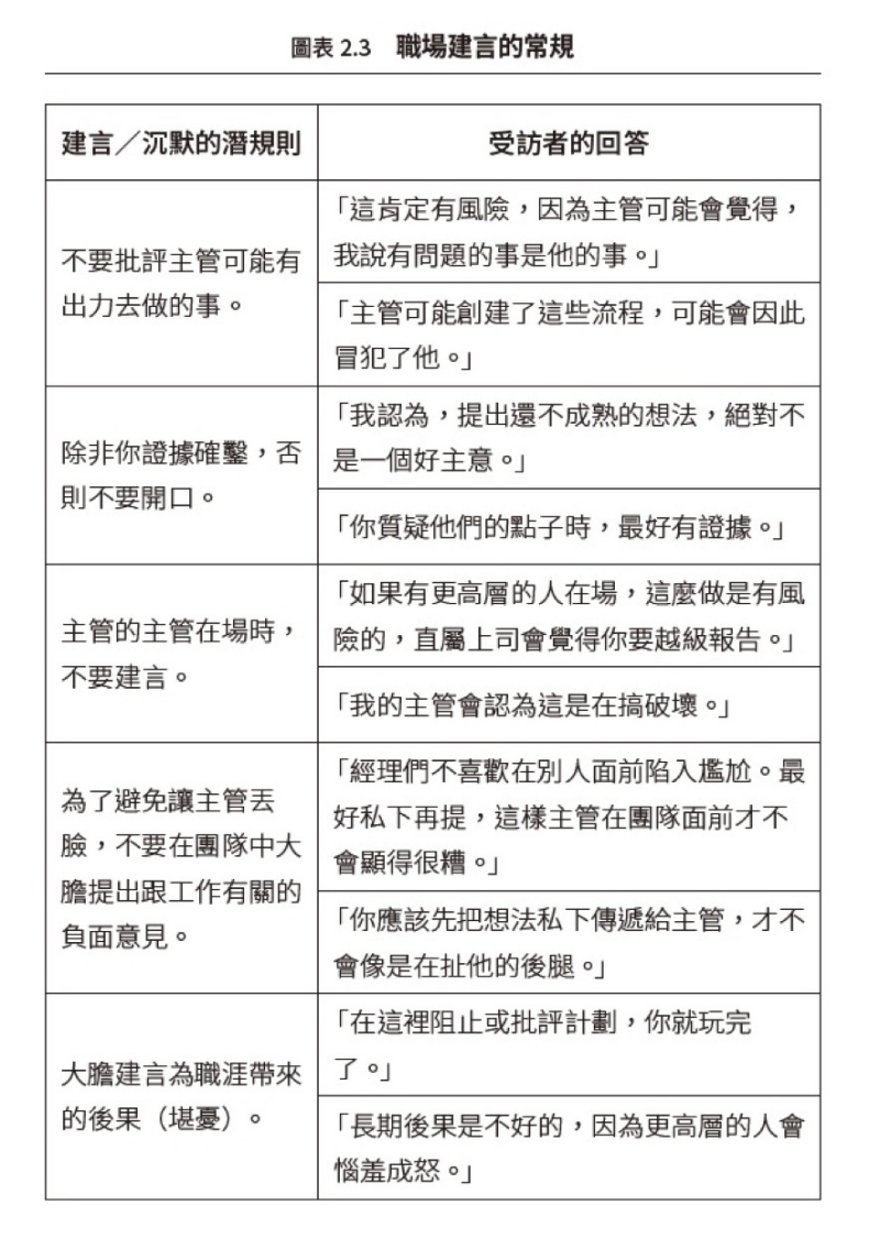 最後,我們發現了一些在工作上勇敢建言的共同信念,這些信念大多被公認是理所當然,我們稱之為「隱性建言理論」(implicit theories of voice)。如圖表2.3所示,這是根據某公司所蒐集的資料而得出的。