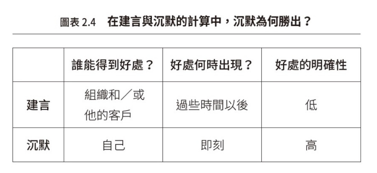 另一種思考建言與沉默不對稱的方式,精髓就在這句話中:「沒有人會因為保持沈默而被解雇。」打安全牌的直覺很強大。組織裡的人不會甘冒人際風險,沒有人想成為犧牲品。可以確信,如果我們保持沉默,就會很安全;至於建言能否真正帶來改變,我們通常缺乏信心——這是一種抑制建言的組合。