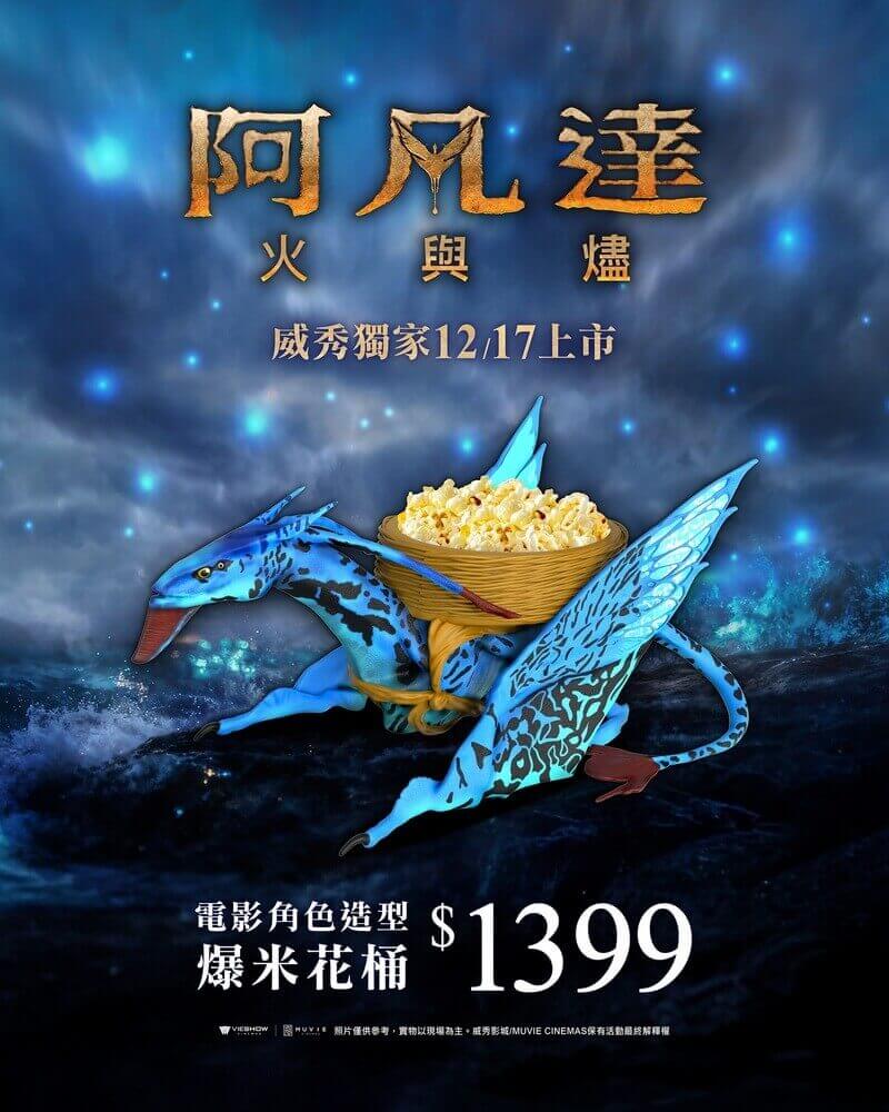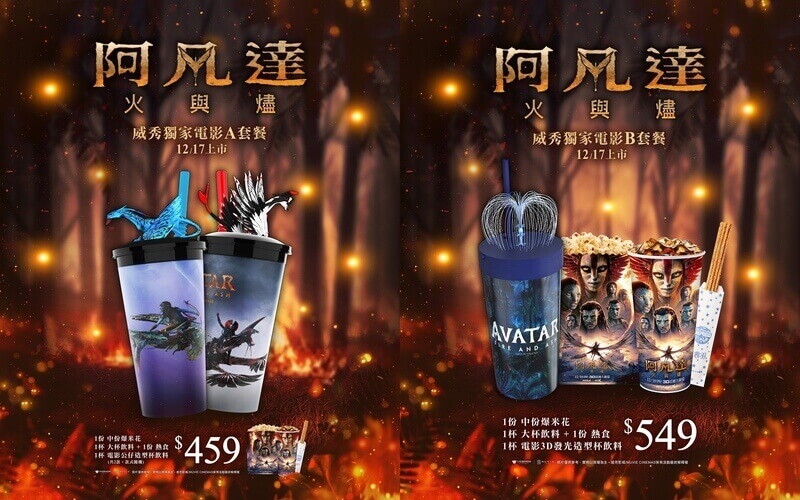- 燼火覺醒套餐:憑《阿凡達:火與燼》電影票可加購電影套餐,內含燼火LED發光杯1個+單人爆米花套餐1份+大杯清涼飲料1杯,售價799元。