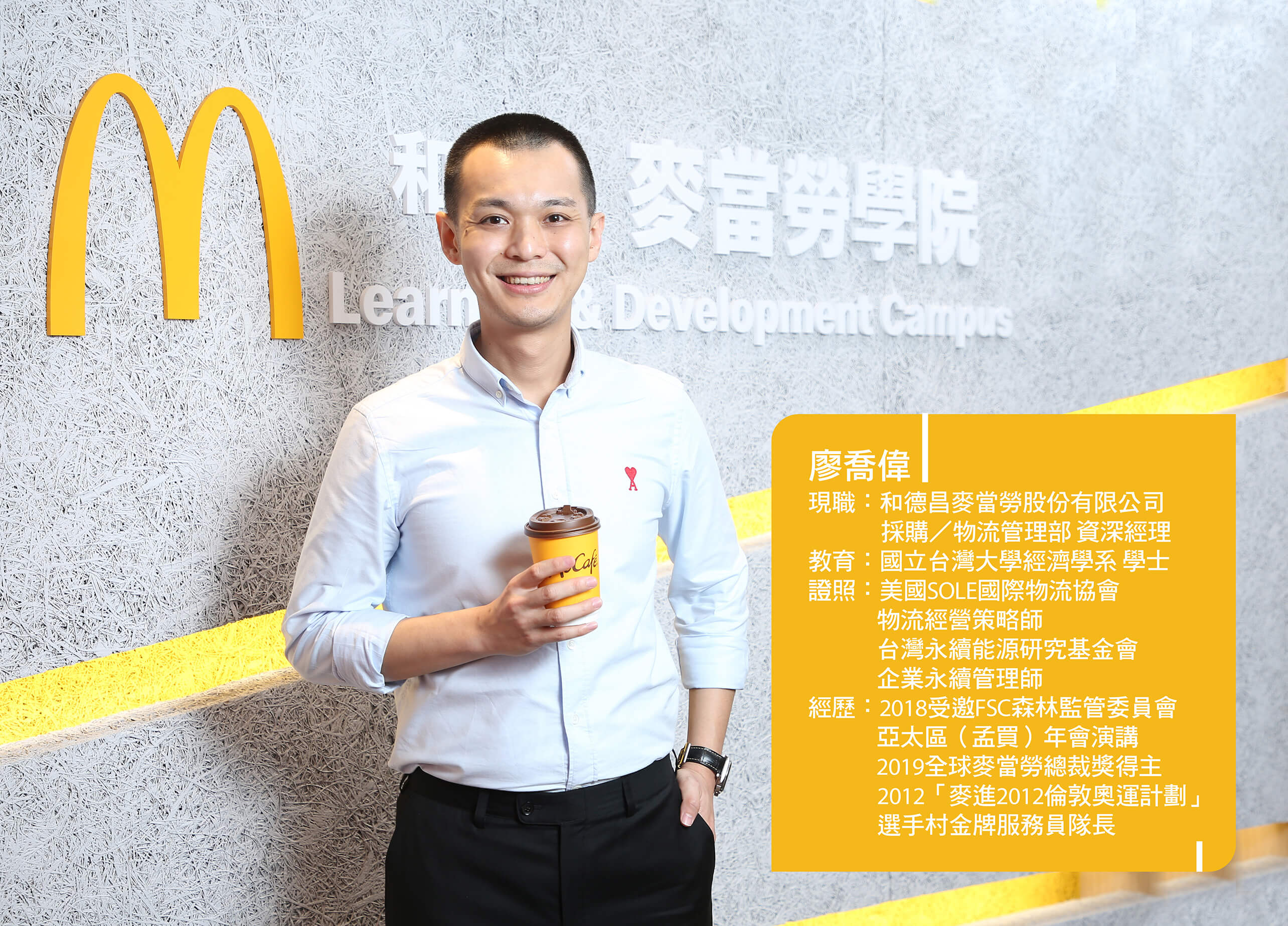 廖喬偉「不三心二意」的專心致志,不僅讓他在一年半內,從鏟薯條的實習生,晉升為管理年營業額破千萬的餐廳經理,也為他的職涯發展帶來新契機:2013年,麥當勞總公司採購/物流管理部門有職缺,在人力資源部門的協助下,廖喬偉轉調到總公司、成為跨部門輪調先例,嫻熟於總公司、營運(餐廳)、與供應商夥伴的跨界經驗,讓他成為即便在麥當勞內部都少有的「三腳凳」經營管理人才;由於不斷運用過去營運經驗與創新方案克服各項挑戰、建構更完善的供應網絡、協助品牌逐步實現對環境友善的承諾,廖喬偉在2019年獲得全球麥當勞「總裁奬」(President Award) 的肯定,與麥當勞全球市場前 1 % 的傑出貢獻人才,一起接受這份殊榮。