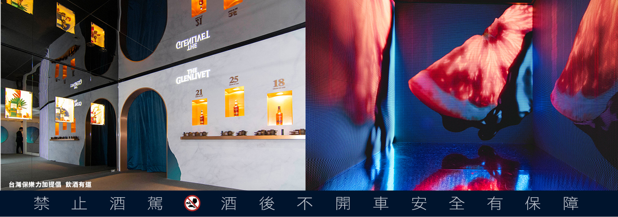 格蘭利威快閃精品店中除了舉辦深度品飲的《奢創桶藝 利威舍宴》品酩會外,場外的「風味探索區」與「品鑑區」也同樣令人驚豔。步入「風味探索區」就會立刻沉浸在格蘭利威經典的斯佩賽標竿花果香元之中,不僅環繞著繽紛視覺,空氣中還伴隨畫面洋溢著風味香氛,為視覺與嗅覺感官帶來滿載的沉浸式體驗。大器的「奢創高年份系列」陳列牆除了展示珍貴的高年份酒款,更透過創意方式引導品聞迷你橡木桶香氣,找出奢創高年份系列的關鍵風味密碼,雅致又饒富趣味。另一邊更陳列了全球僅有台灣獨賣的格蘭利威「獨獻台灣系列」,奢華繽紛的裝飾與象徵「台味覺醒」的利威與台灣意象融合的主題LOGO 遙相呼應著。