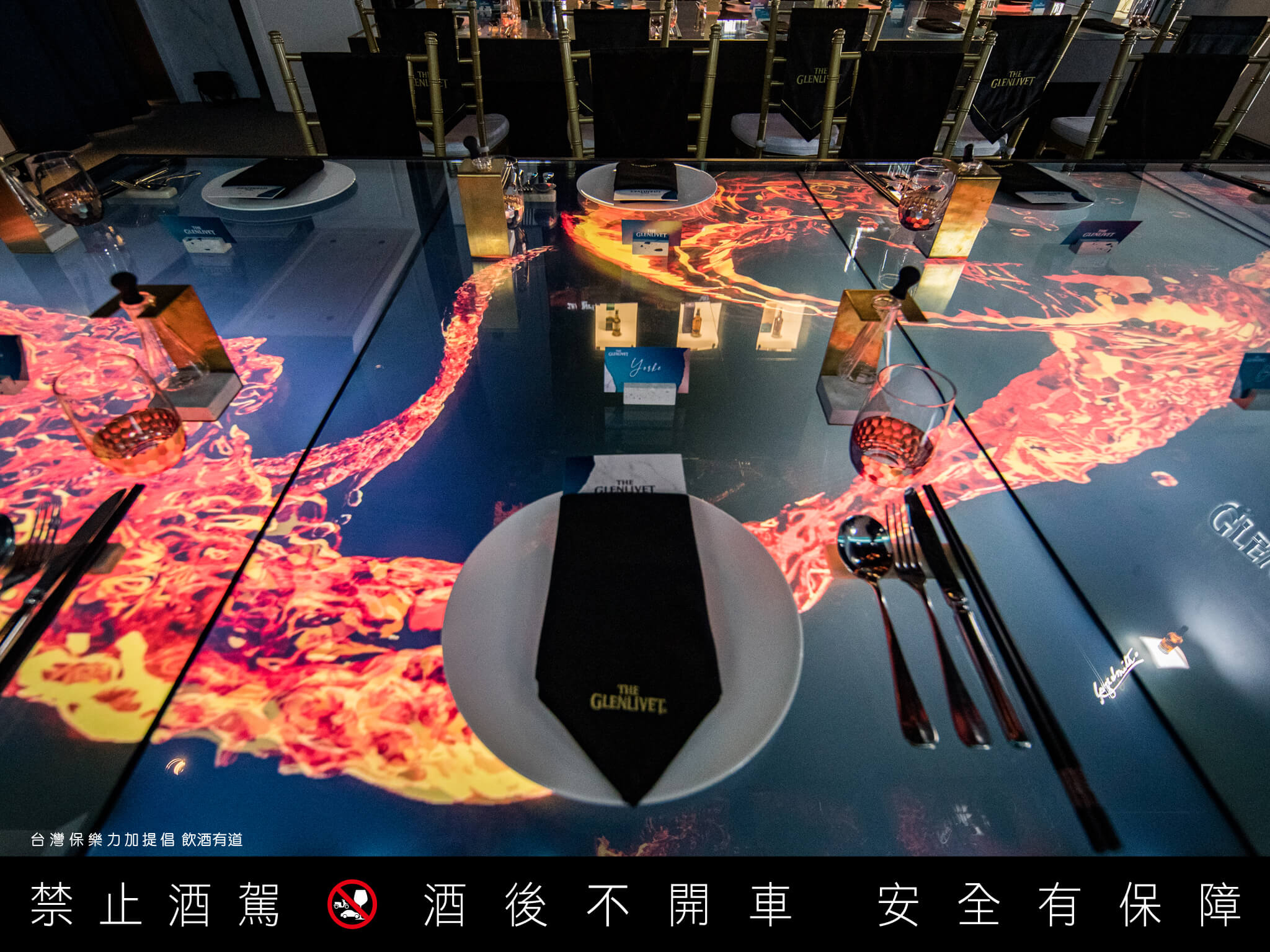 在出菜以先就迎來視覺震撼,餐桌彷彿幻化為舞台,透過巨型桌面螢幕讓酒款的重要風味原素繽紛展演出來,震撼的聲光效果與與桌面金黃的威士忌酒液相互閃耀輝映,彷彿舌尖已品嚐到酒液的富饒風味。
