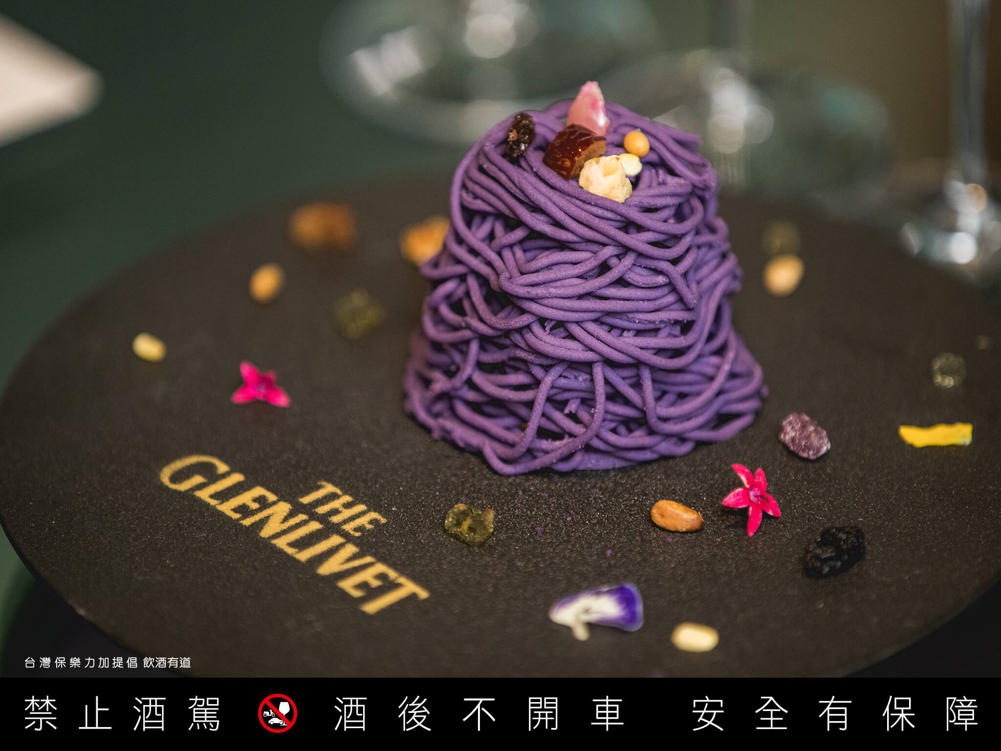最後的甜點是芋泥蒙布朗及桂花蜜晶凍,則是以台式八寶芋泥概念出發,將大甲檳榔心芋頭以法式甜點蒙布朗型態呈現,完全顛覆了大眾對台式甜品的既定印象,更替《奢創桶藝 利威舍宴》品酩會的奢華跨界創新精神畫下完美句點。