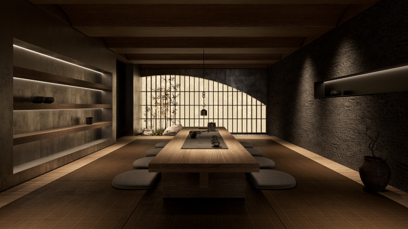「結廬在人境,居無車馬喧」,如此桃花源的想像是茶道中人追求的極致,因此在家中蓋一間草屋有點瘋狂,但透過不同材質的鋪陳與引導,進入一處低調高雅的秘境,便是進入茶儀式的第一步;和室的靜謐氛圍,也總能讓訪客心曠神怡。在享受過音樂後,再以茶香留人,用最文雅的方式拉近彼此的距離。