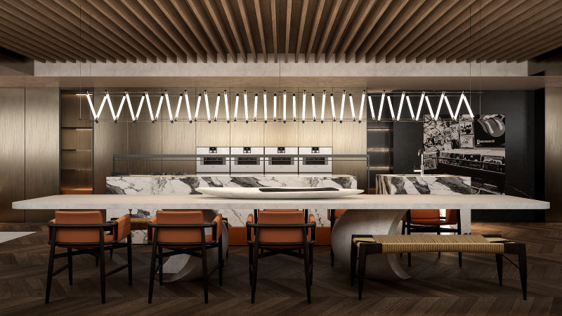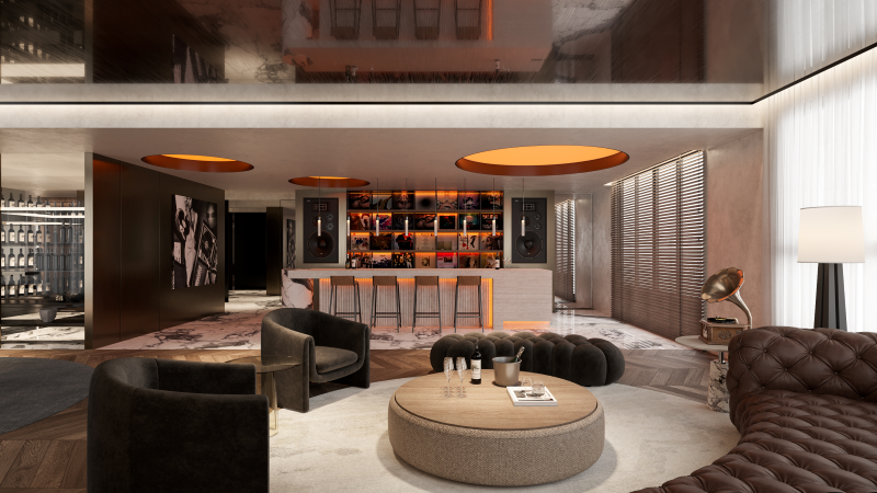 針對這次的非家之家空間,希望以「人生巔峰的成就,正是集所愛一切的美好於一室」的理念勾勒這樣的空間設計,實踐讓主人們享受交誼、實踐嗜好,與展示生活藝術藏品的場域。