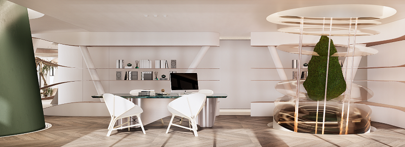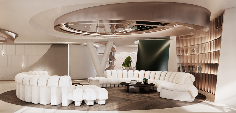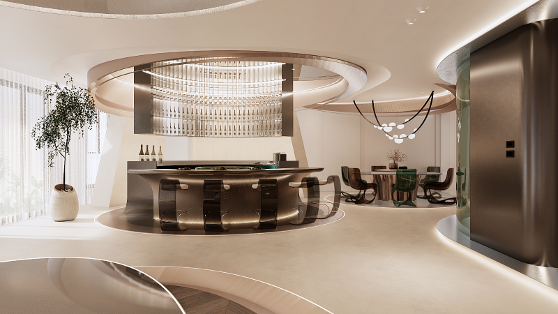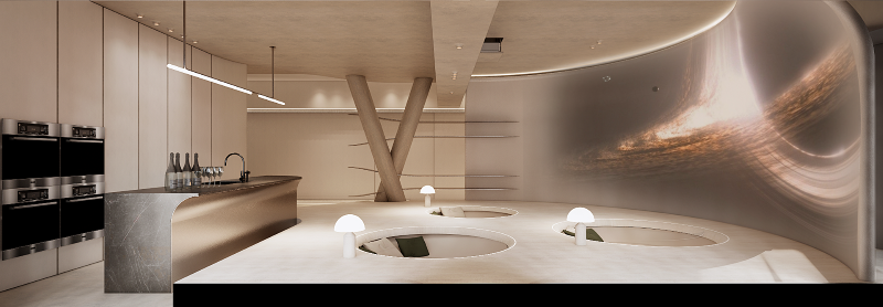 結合生活、 藝術與未來感,以綠洲為靈感發想來回應城市,象徵新時代來臨的這座空間,結合現實與虛幻,把虛擬世界帶到真實。設計師以自然、隕石與星月等萬物在空間中留下生命的軌跡,凝結成永恆的藝術,也帶著來到空間中的訪客探索未來。以弧線玩轉在曲線宇宙之中,模糊空間與空間之間的界限。這座「非家之家」即是用大膽的設計思維賦予居住者生活想像,創造出嶄新的複合式空間樣貌。