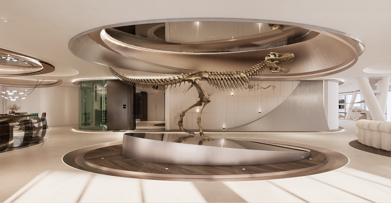 大門口的迎賓吧台、氣勢滂礡的收藏品展示台,以及適合接待客人的沙發交誼廳,能讓訪客感到自在與舒適,在social的過程也能欣賞藝術收藏品。要是第一次見面,這些主人的寶貝更是最佳的 ice breaker。除了門口處的完整恐龍化石,野心勃勃的企業家還有其他珍稀寶貝,這些得來不易的藏品都能在「研究展示空間」找到自己的落腳處,讓這座空間又多了一個能夠策劃展覽的可能性。無論是展示自己的收藏還是替其他企業主在此舉行個人藏品展示會,都是能夠吸引各領域人脈在此匯集的理由,當人們到此處,誰說企業總部只能開會不能開趴?